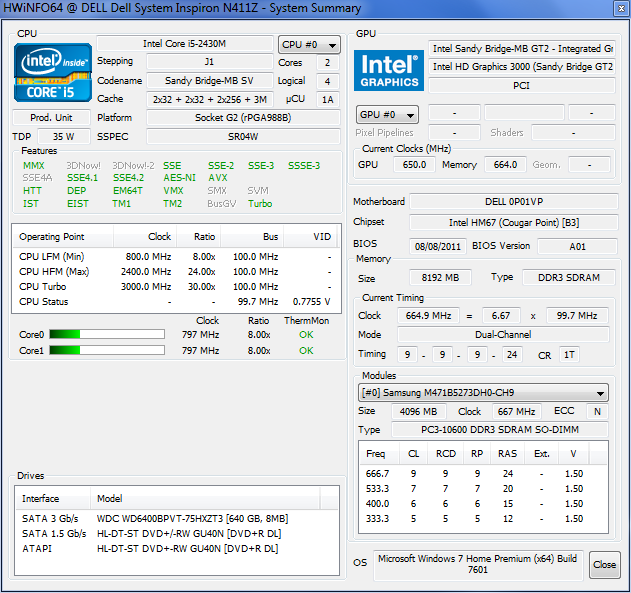 Unser Testmodell kommt mit dem noch eher unbekannten Intel Core i5 2430M. Dieser Prozessor ist mit 2.4-GHz-Basistakt etwas schneller als der beliebte Intel Core i5 2410M, der mit 2.3 GHz arbeitet. Weiterhin sind 8 GB DDR3-Ram mit 1333 MHz im Dual-Channel-Mode verbaut. Die Festplatte kommt von Western Digital und nennt sich WD6400BPVT. Sie hat, wie der Name schon vermuten lässt, 640 GB Speicher und dreht mit 5.400 U/min.