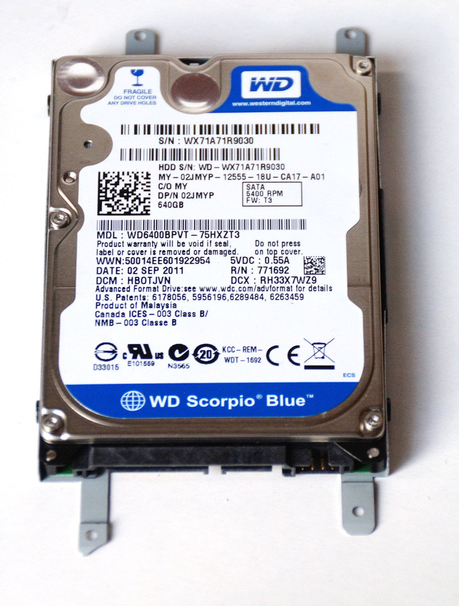 Die Festplatte ist von Western Digital und fasst 640 GB an Daten. Es wurde eine langsamere Variante mit 5.400 U/min gewählt, und so sind von der Festplatte keine überdurchschnittlichen Transfergeschwindigkeiten zu erwarten. Für die Drehzahlen schlägt sich die Festplatte noch recht gut und schafft in HD Tune eine durchschnittliche Transferrate von 68,5 MB/s. Mit einer Zugriffszeit von 19 ms liegt die HDD im Mittelfeld. Mit einer SSD könnte man die Performance des Systems aber deutlich steigern.