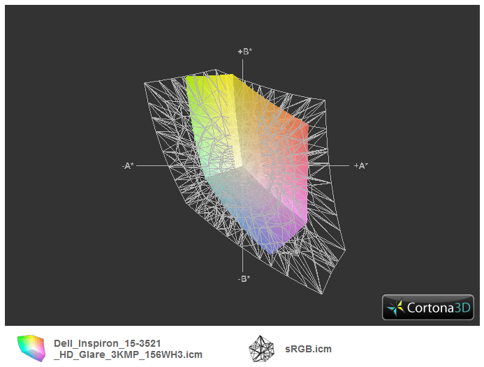 Farbräume und TFT-Kalibrierung sind ein Thema für die professionelle Zielgruppe, die sich mit Bildbearbeitung und Druck beschäftigt. Das ist nicht die Zielgruppe des Inspiron 15, aber die Messergebnisse wollen wir der Vollständigkeit wegen auflisten. Der kleine sRGB-Raum wird nicht annähernd abgedeckt (52 %), folglich auch nicht AdobeRGB (35 %).