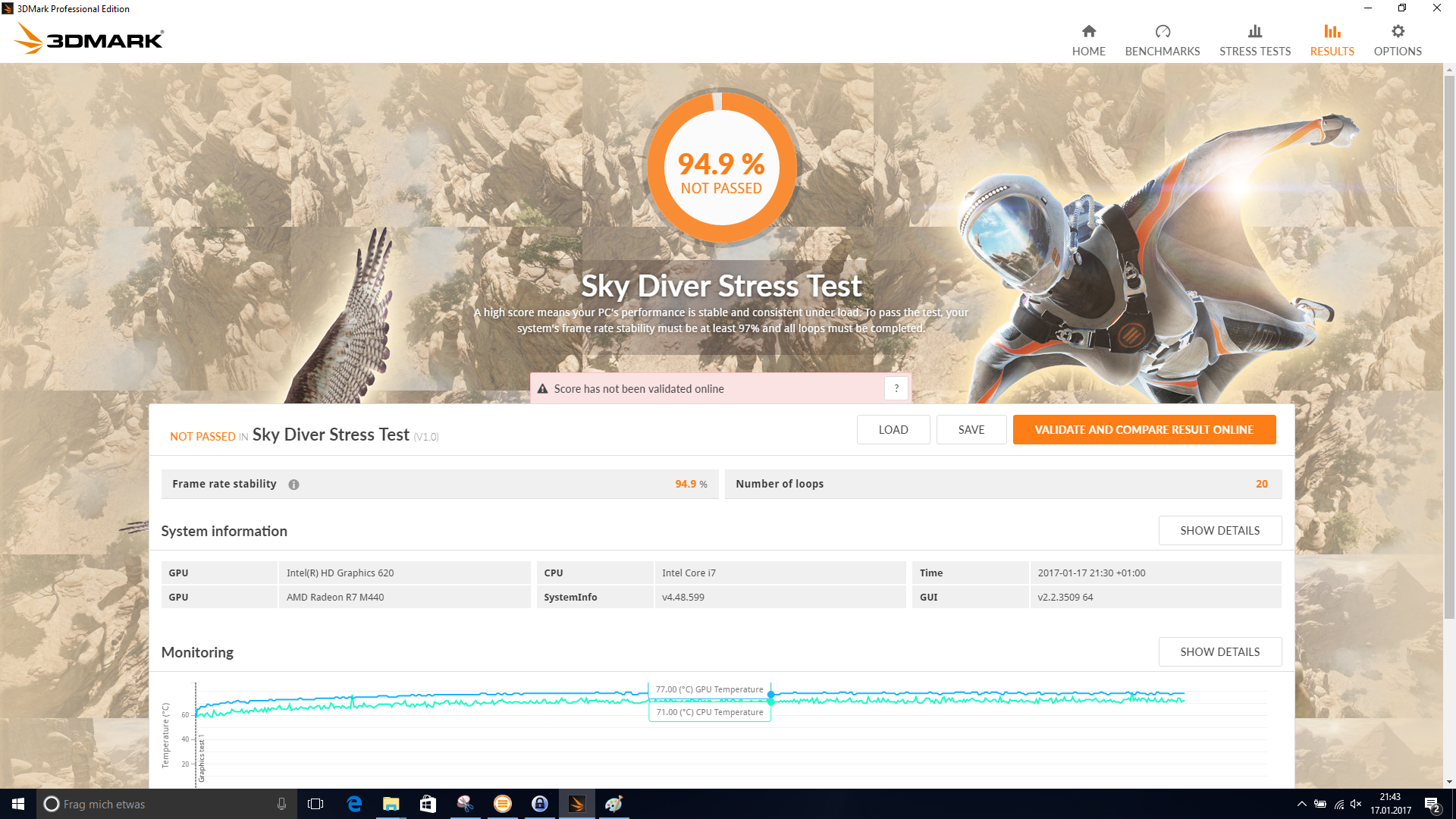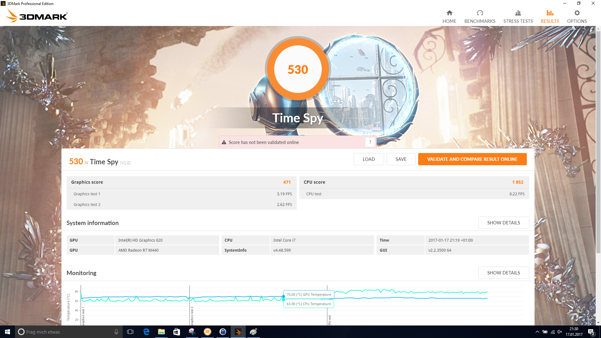 Die Kühleinheit in unserem Testgerät besteht aus einer Heatpipe, welche CPU und GPU bedeckt, sowie einem kleinen Lüfter, der die entstehende Wärme aus dem Gehäuse befördert. Vorweg gesagt reicht das Kühlsystem, um die Komponenten zu kühlen, wenngleich unter Belastung die Temperaturen des Prozessors recht nah an der Grenze zum Thermal-Throttling sind. Unter der einstündigen Dauerbelastung mit Prime95 und Furmark zeigt HWiNFO eine maximale Kerntemperatur des Prozessors von 93 °C. Die Taktfrequenz liegt bei etwa 2,9 GHz. Bei der AMD Radeon R7 M445 klettert die Core-Temperatur auf 79 °C bei einem Takt von 920 MHz. Mit diesen Werten bleibt nicht viel Spielraum, was im Umkehrschluss bedeutet, dass durch Verschmutzung schnell die kritische 100-°C-Marke beim Prozessor erreicht werden kann. Um die 3D-Leistung nach anhaltender Dauerbelastung zu prüfen, haben wir direkt im Anschluss den 3DMark 11 erneut durchlaufen lassen. Das Ergebnis ist in etwa ident mit einem Durchgang ohne vorheriger Belastung.