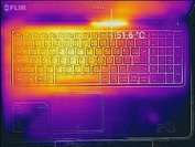 Die Gehäusetemperaturen liegen bei unserem Testgerät auf dem zweithöchsten Level. Nur das Acer Aspire E5 erwärmt sich noch mehr. Der Hotspot bei unserem Gerät befindet sich mittig im hinteren Bereich der Base. Unterseitig notieren wir einen Wert von 51,3 °C. Wir empfehlen, das Gerät bei starker Belastung eher auf eine feste Unterlage zu stellen, um genügend Zirkulation zu gewährleisten. Im Bereich des Hotspots befinden sich unterseitig die Lüftungsschlitzte, durch die der Lüfter die Frischluft ansaugt.