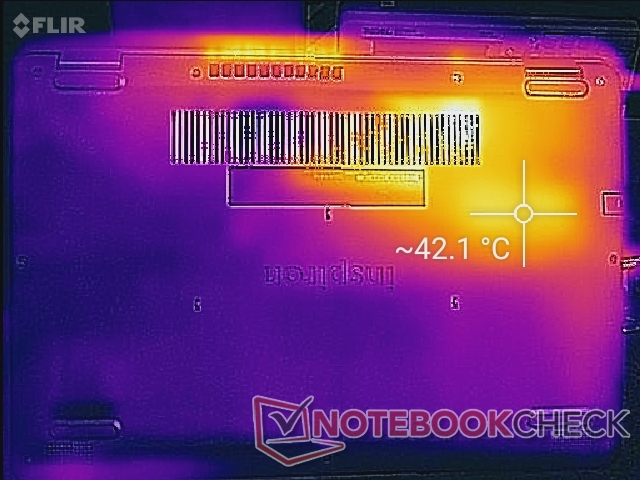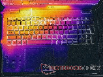 Unter hoher Last können die warmen Stellen sowohl auf der Oberseite als auch auf der Unterseite des Laptops bis zu 41 °C erreichen, was 50 °C beim dünneren Acer Swift 5, das mit der gleichen CPU und der gleichen integrierten GPU ausgestattet ist, gegenübersteht. Die Handballenauflagen bleiben ähnlich wie die WASD-Tasten kühl, und die Bedienung dadurch komfortabel.