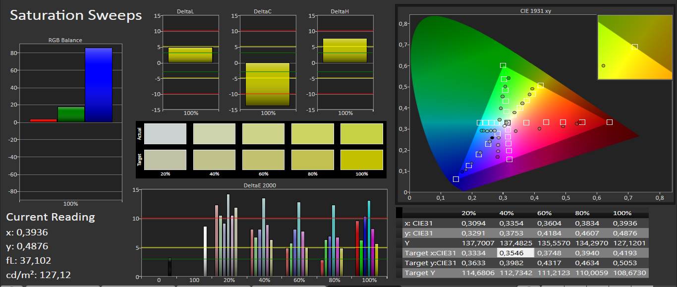 Im Auslieferungszustand zeigt der Bildschirm eine DeltaE-2000-Abweichung von 8,82. Anzustreben wäre ein Wert kleiner 3. Zudem verfügt das Display über einen Blaustich.