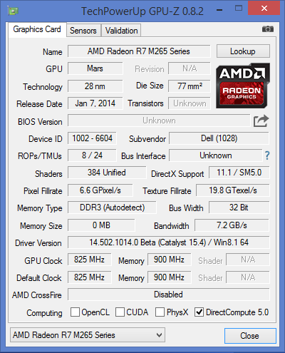 Das Haswell Vorgänger-/Schwestermodell des Inspiron - das Inspiron15-5547 - ist mit einem Radeon R7 M265 Grafikkern bestückt. Wer nun von der R7 M270 GPU aufgrund der etwas höheren Nummer auch etwas mehr Leistung erwartet, wird enttäuscht. Technisch sind beide GPUs identisch. Sie unterstützen beide DirectX 11.2 und arbeiten mit Geschwindigkeiten bis zu 825 MHz. Entsprechend bewegen sich die Resultate in den 3D Mark Benchmarks auf einem Niveau. Zudem: Seitdem wir den neuesten Grafiktreiber von AMD installiert haben, trägt die GPU im Geräte-Manager die Bezeichnung "Radeon R7 M265".