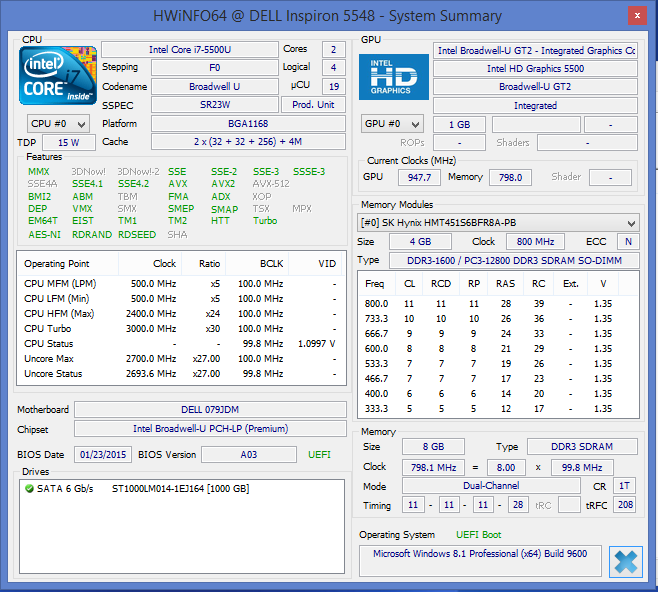 Das Inspiron wird von einem Intel Core i7-5500U Zweikernprozessor (Broadwell) befeuert. Die CPU arbeitet mit einer Basisgeschwindigkeit von 2,4 GHz. Mittels Turbo kann die Geschwindigkeit auf 2,9 GHz (zwei Kerne) bzw. 3 GHz (ein Kern) beschleunigt werden. Der Turbo kommt nur im Netzbetrieb zum Einsatz. Die CPU-Tests der Cinebench Benchmarks werden mit 2,9 bis 3 GHz (Single-Thread) bzw. 2,6 bis 2,8 GHz (Multi-Thread) bearbeitet. Im Akkubetrieb geht die CPU mit 2,4 GHz zu Werke.