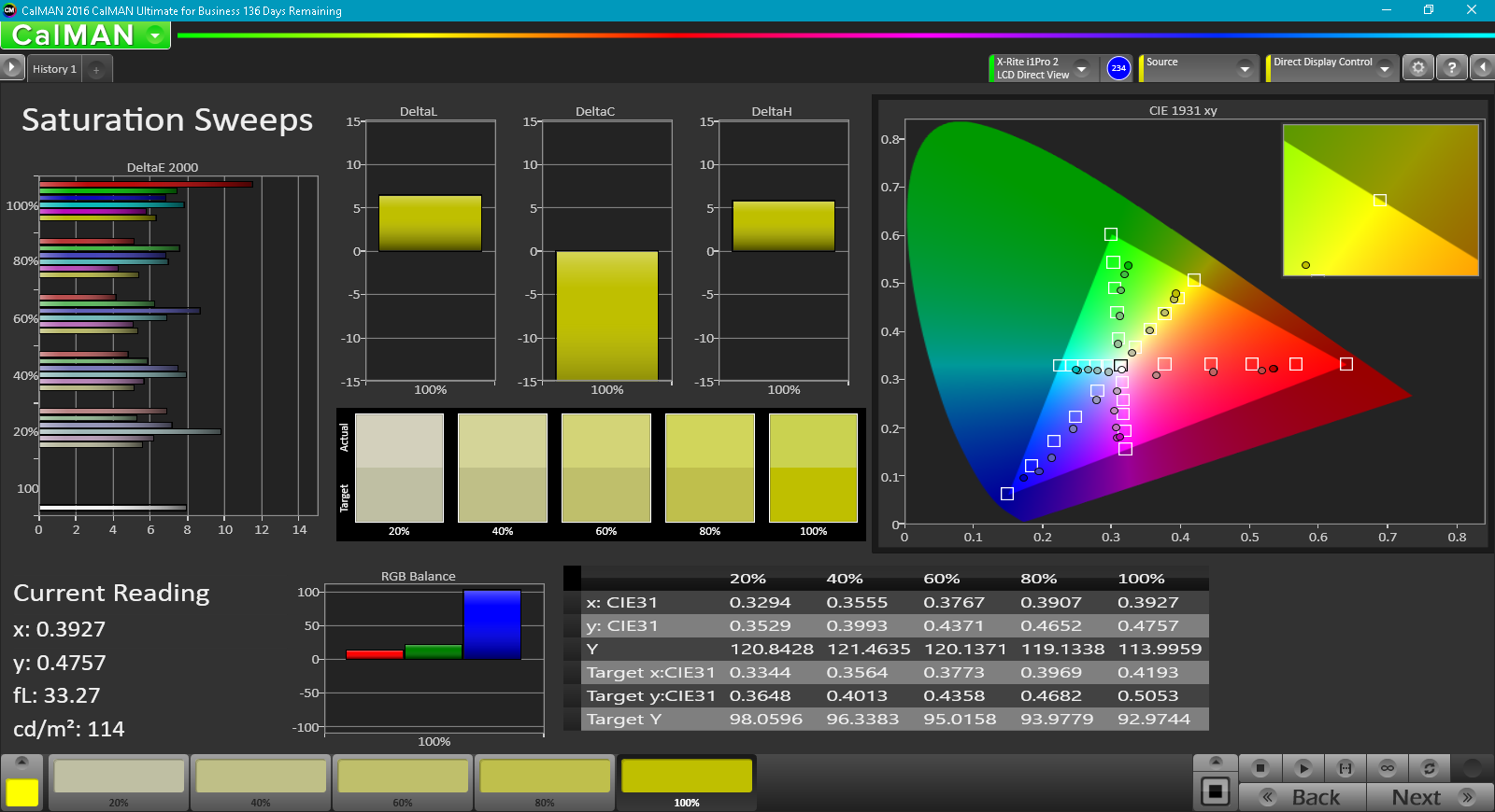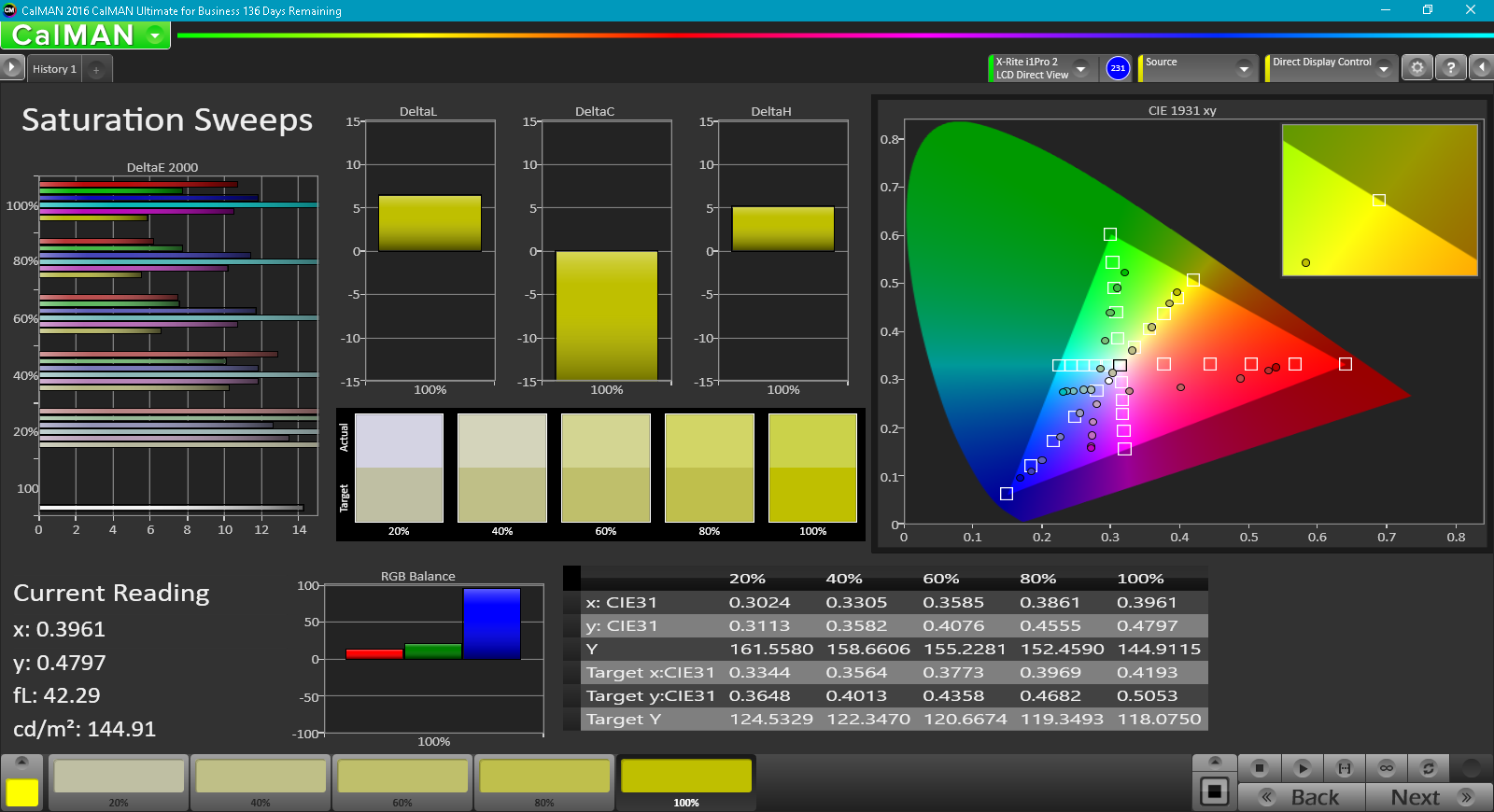 Mit einem X-Rite-Spektralfotometer und der professionellen CalMAN Software ermitteln wir hohe durchschnittliche DeltaE-2000-Abweichungen, zudem gibt es einen deutlichen Blaustich. Mit einer Kalibrierung verbessert sich die Situation zwar, doch insgesamt ist die Leistung im Vergleich zu anderen günstigen (unkalibrierten) Panels immer noch nicht besonders gut.