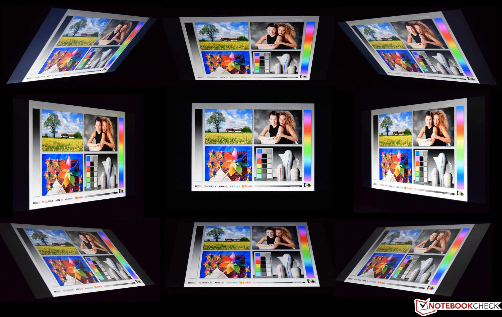 Beim Blickwinkeltest sehen Sie ein gutes IPS-Panel, welches das Testbild aus allen Blickwinkeln sehr gut darstellen kann. Auch die sonst häufig zu beobachtenden Farbveränderungen (Schleierbildung) an den Eckbildern ist bei unserem Testgerät so gut wie nicht vorhanden.