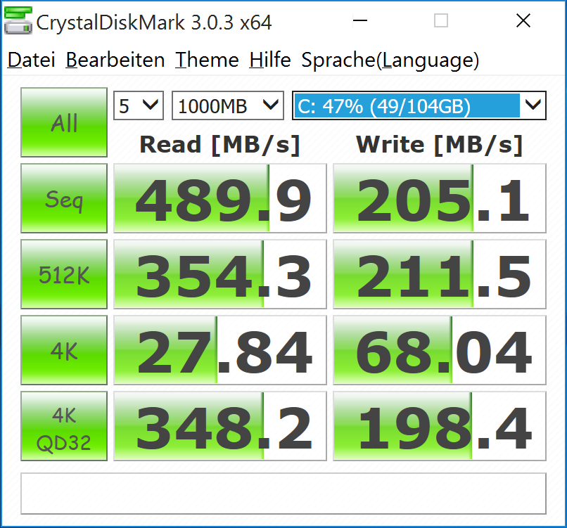Erstaunlich: Während das Acer Aspire hier nur auf mickrige 10 MB/s kommt, ist es den beiden anderen SSD-Notebooks im Test massiv überlegen, wenn die 4K-Blöcke mit mehreren Threads gleichzeitig (4K-64 Read) gelesen werden. Der CrystalDiskMark 3.0 bestätigt dieses Phänomen nicht, sodass wohl entweder ein Fehler unsererseits oder ein nicht nachvollziehbarer Ausreißer vorliegt. In Sachen Schreibleistung, die weit weniger wichtig ist, setzt sich das Zenbook Pro mit deutlichem Abstand an die Spitze. Insgesamt bildet die eher gemächliche Lite-On CV1-8B128 im Acer das Schlusslicht, während sich die SSDs im Dell und im Testgerät auf hohem Niveau auf Augenhöhe begegnen. In jeder Hinsicht abgeschlagen ist natürlich die für HDD-Verhältnisse schon fixe Platte im MSI PE60.