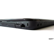 Ebenfalls von links nach rechts auf der rechten Seitenpartie des Gehäuses zu finden: 7-in-1-Medienkartenleser, optisches Laufwerk, USB 2.0/eSATA Kombianschluss, RJ45 LAN Port und die Vorrichtung zur Anbringung eines Kensington Locks.
