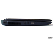 So befindet sich auf der linken Seite, von hinten nach vorne, ein USB 2.0 Port, die Lüftungsöffnung, zwei Audioports für Mikrofon und Kopfhörer sowie der HDMI Port.