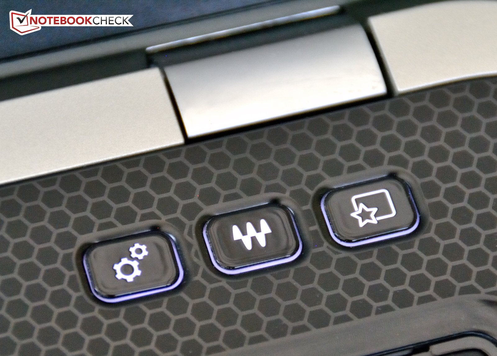 Abgesehen von dem großen hinterleuchteten Startknopf, gibt es rechts noch drei Zusatztasten. Die erste öffnet das Mobilitätscenter von Windows, in dem man eine Übersicht von häufig verwendeten Einstellungen findet. Die zweite Taste öffnet ein kleines Fenster, bei dem man ein Profil für die Soundkarte (Spiel, Musik, Film, …) auswählen kann. Die dritte Taste lässt sich individuell belegen.