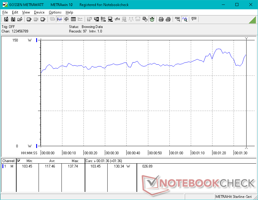 Wir konnten an dem mittelgroßen (~15,3 x 7,5 x 2,6 cm) 130-W-Netzteil einen maximalen Verbrauch von 137 W messen. Trotz der anspruchsvolleren CPU hat Dell keine Änderungen an dem Netzteil oder dessen Leistung vorgenommen.