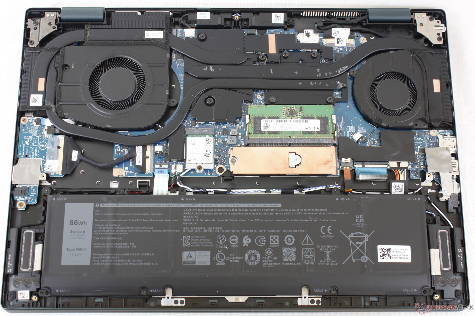 Die Bodenplatte kann mithilfe eines einfachen Kreuzschraubenziehers entfernt werden. Im Inneren trifft man auf eine andere Kühllösung als beim 7610. Den Neuerungen sind ein SODIMM- und ein M.2-SSD-Slot zum Opfer gefallen, wodurch das 7620 nur noch einen SSD- und einen SODIMM-Slot besitzt, wie die Bilder unten zeigen. Eigenartigerweise hat das RTX-3060-Modell zwei SODIMM-Steckplätze.
