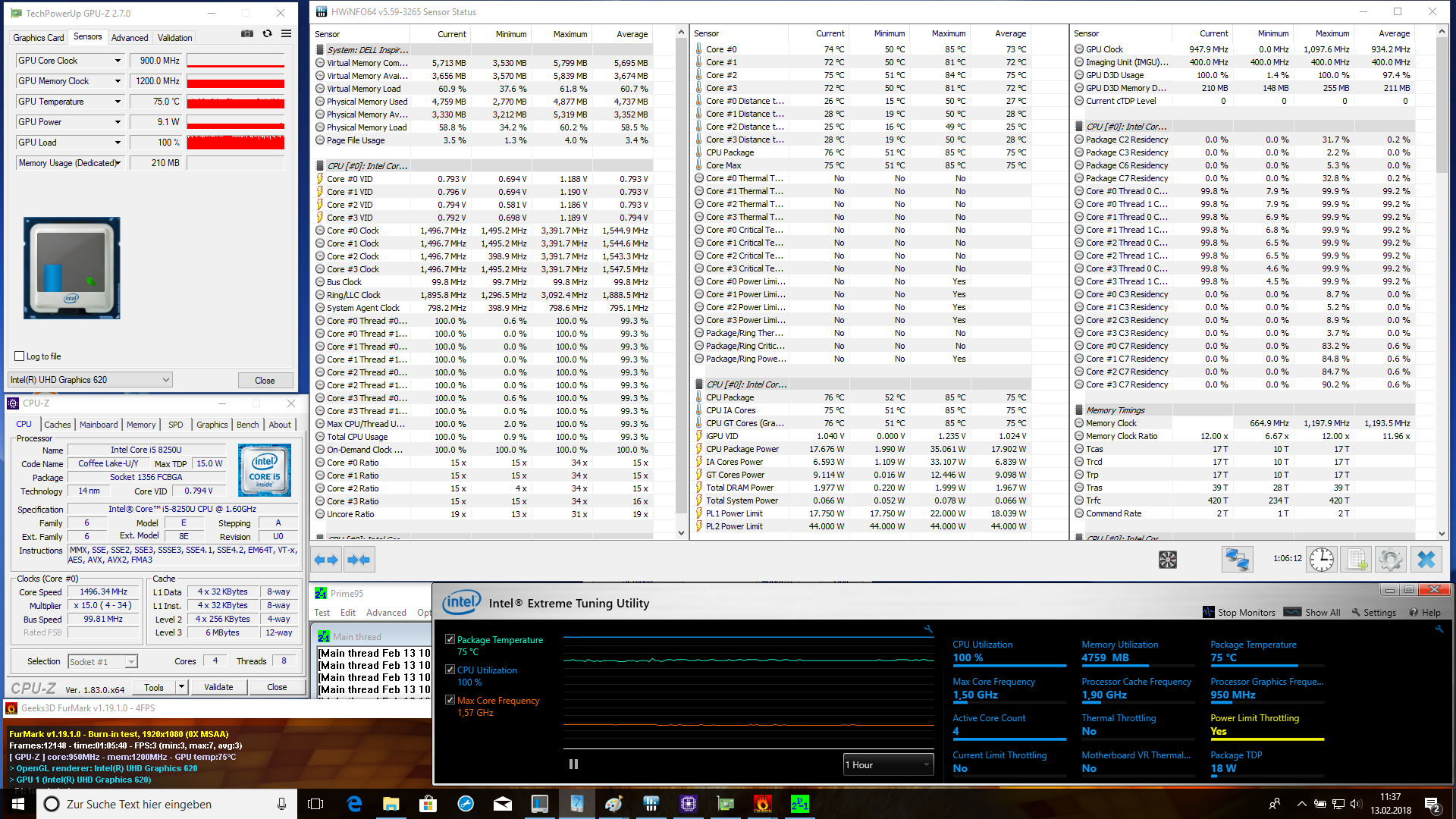 Das Gehäuse des Dell Inspiron 17-5770 erwärmt sich unter Last nur gering. Den wärmsten Punkt messen wir auf der Unterseite mit 37 °C. Ein sehr gutes Ergebnis, denn alle Vergleichsgeräte werden deutlich wärmer. Zu deren Verteidigung muss jedoch auch erwähnt werden, dass diese allesamt mit einer dedizierten Grafikkarte ausgestattet sind. Diese zusätzliche Wärmequelle fehlt in unserem Test-Sample. Beim Stresstest zeigt sich allerdings, dass die Kühleinheit schnell an ihre Grenzen stößt. Bei der Cinebench R15-Mulit-Schleife konnten wir schon nach dem ersten Durchgang einen deutlichen Leistungseinbruch verzeichnen. Beim Stresstest mit Prime95 war zu beobachten, dass schon wenige Sekunden nach dem Start die Temperaturen in den kritischen Bereich geschnellt sind. Im einstündigen Lasttest pendelten sich die Temperaturen des Prozessors bei 79 bis 84 °C ein. Trotz der hohen Temperaturen konnte Intel Core i5-8250U einen Takt von 2,7 GHz halten. Die 3D-Leistung wurde nicht wesentlich gedrosselt. Der direkt im Anschluss durchgeführte 3DMark 11 ist mit 1.692 Punkten nur unwesentlich schlechter als im Vergleich zum Kaltstart.