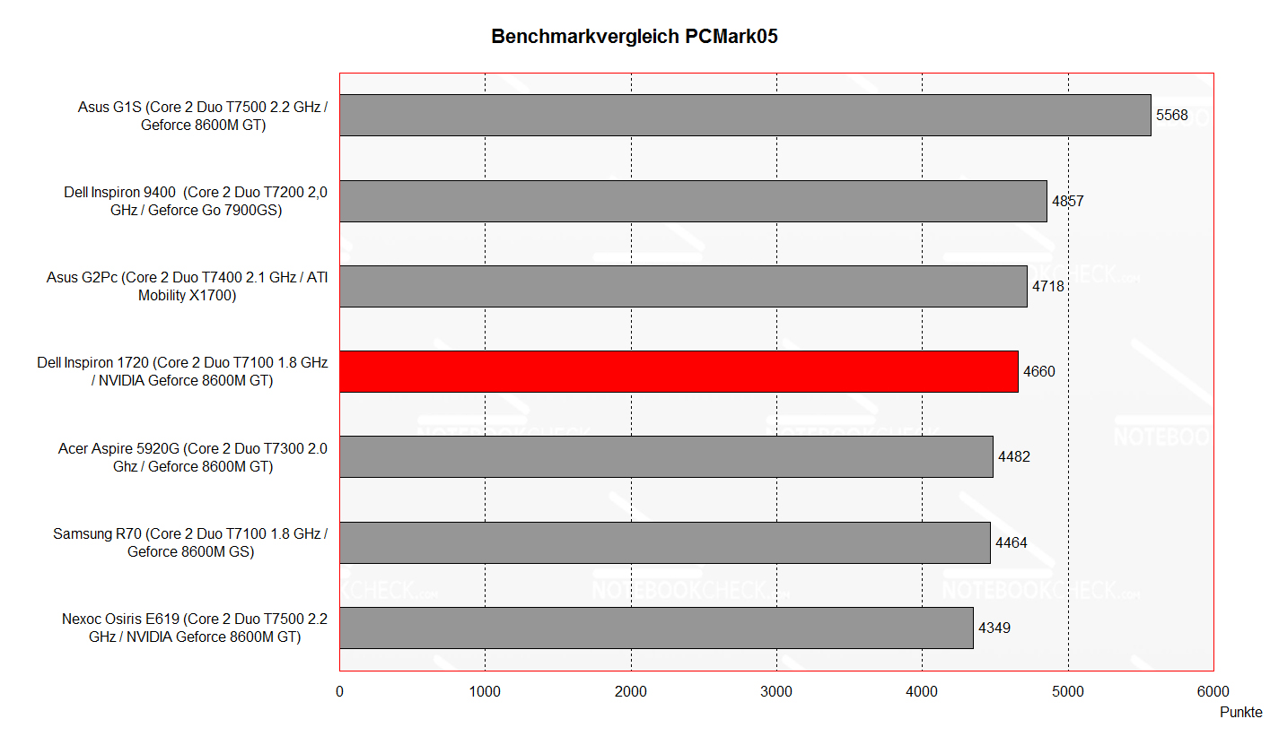 Die Performance des Gerätes fällt etwas unspektakulär aus. Zwar wird ausreichend Leistung geboten um auch aktuelle Spiele (wenn auch mit Einschränkungen) spielen zu können, am Limit mit der verbauten Hardware ist das Inspiron 1720 aber noch lange nicht. Wir hoffen auf baldige Ausstattungsvarianten mit leistungsfähigeren Grafikkarten.