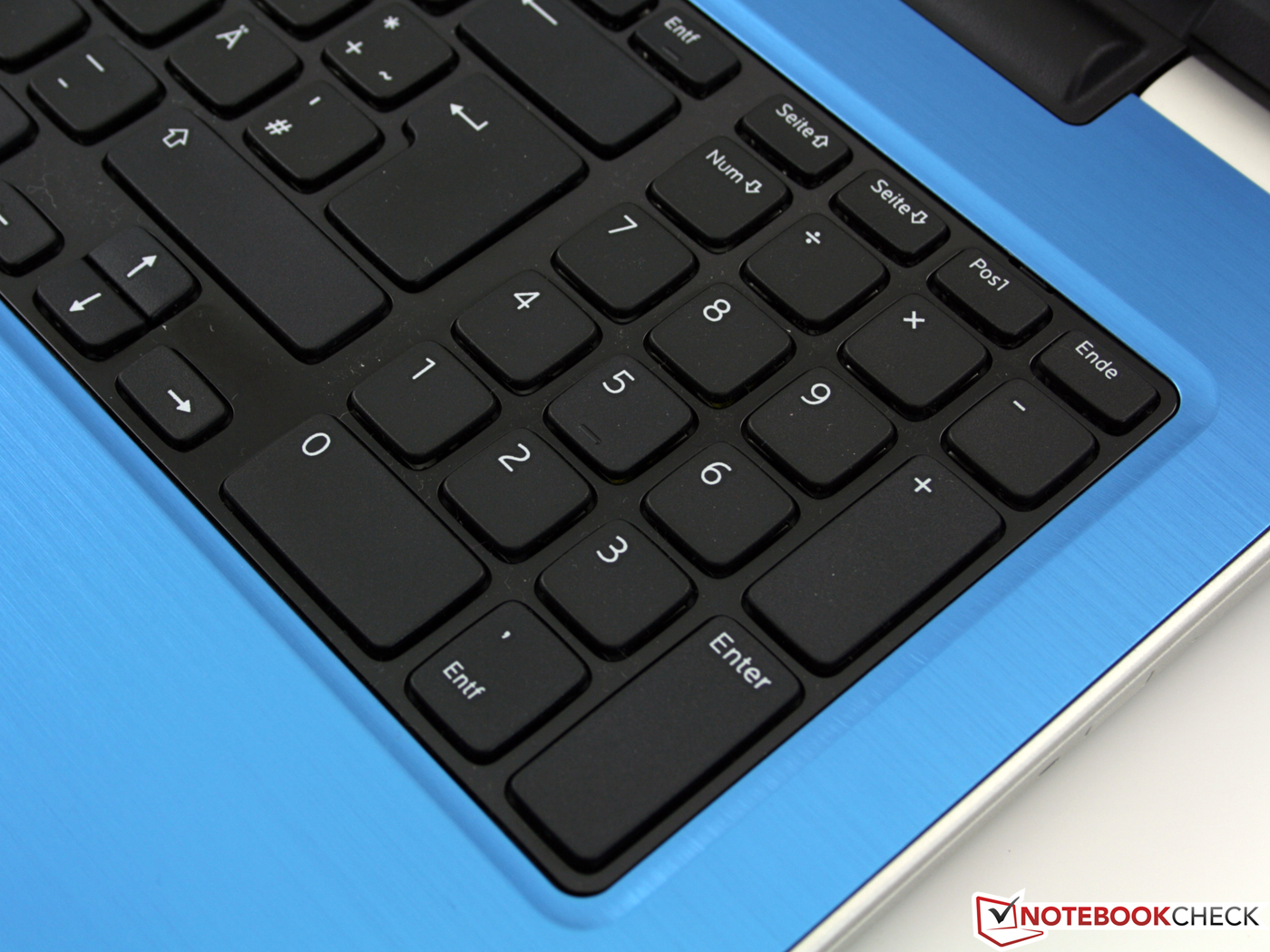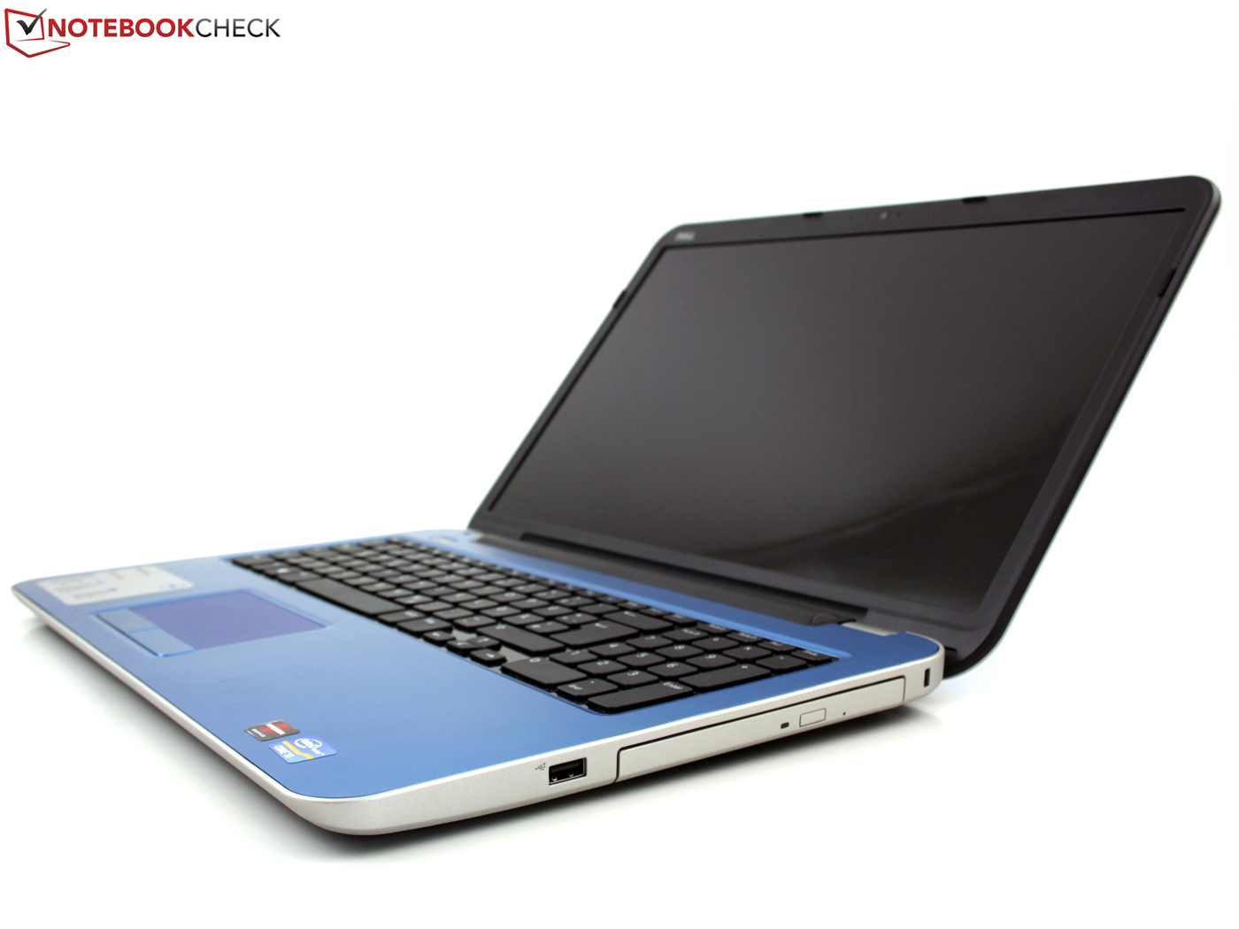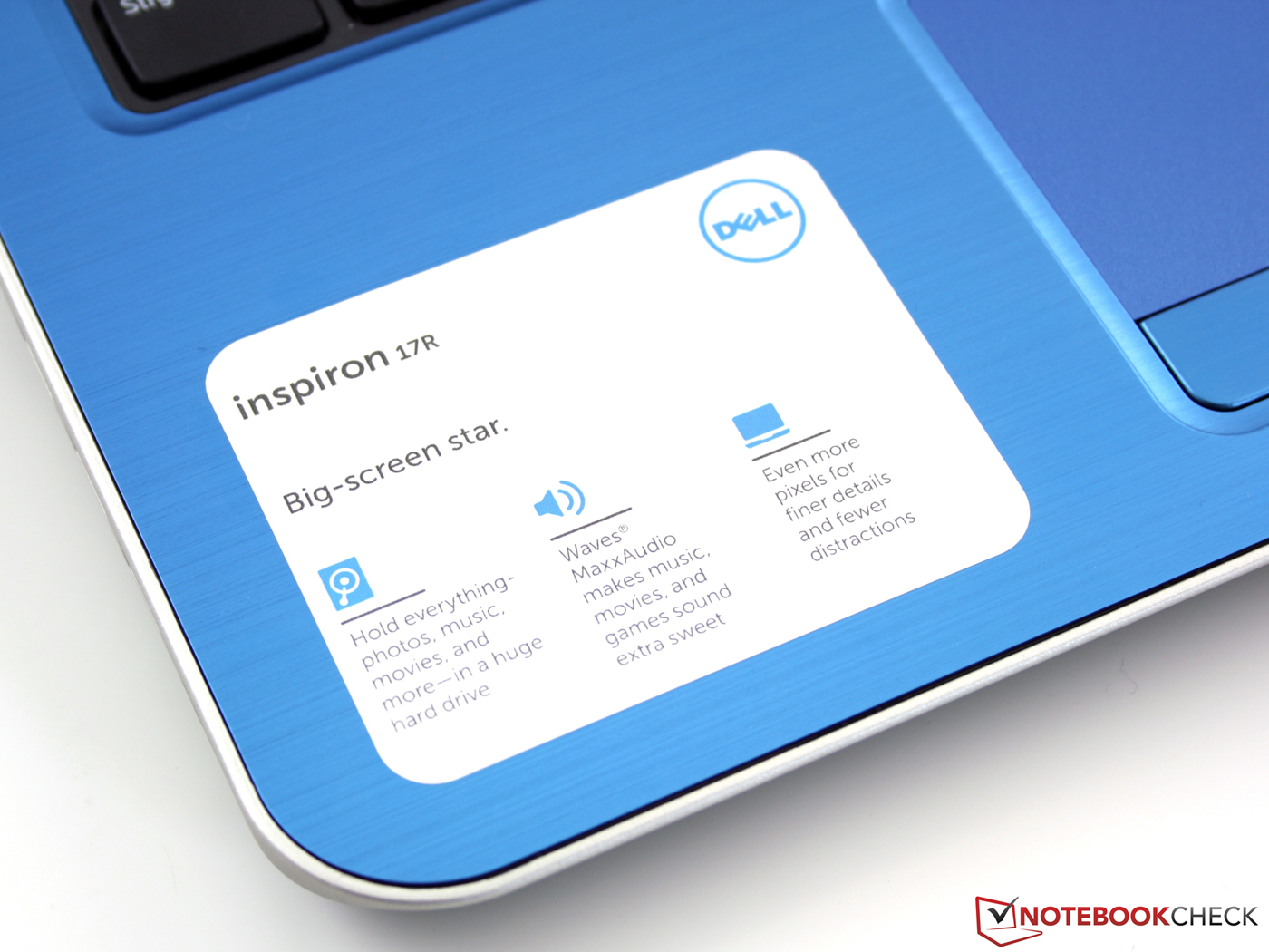Im Vergleich zum 2012er Inspiron 17R-SE-7720 (eloxiertes Aluminium) und zum 2011er Inspiron 17R (N7110), beide mit einem austauschbaren Display-Cover, besitzt der neue Inspiron kein solches Tausch-Cover mehr. Jetzt bedeckt mattes, strahlend blau eloxiertes und gebürstetes Aluminium den Deckel und die Handauflage. Dies ist ein guter Zug von Dell, auch wenn das Material auf das Gewicht drückt (2,91 kg). Die kühlen Flächen berühren sich wertig, verhindern Fingerabdrücke und sorgen für eine sehr gute Stabilität. Das gilt besonders für die große Handballenauflage, die an keiner Stelle auch nur eine Hauch eingedrückt werden kann.