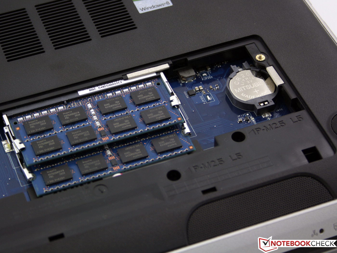 Wartungsoptionen haben Nutzer per Klappe auf der Unterseite. Festplatte (2,5 Zoll), RAM (2 Bänke belegt, 2x 4 GB) und CMOS-Batterie sind zugänglich. Das WLAN-Modul bleibt leider im Verborgenen. Für die Wartung des Lüfters müsste die komplette Bodenplatte abgenommen werden.
