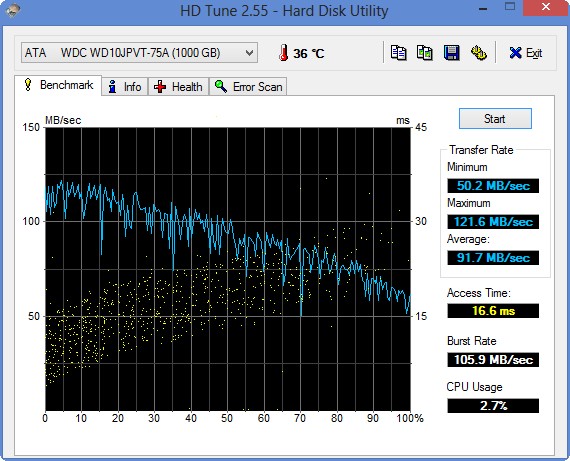 Die Western Digital Scorpio Blue (WD10JPVT-75A1Yt0) bietet 1.000 GB Speicherplatz, mehr kann aktuell nur in Ergänzung durch eine SSD oder in einem Notebook mit zwei Festplatten zu finden sein. Die 2,5-Zoll-Festplatte (Bauhöhe 9,5 mm) hat nur eine Rotationsgeschwindigkeit von 5400 RPM. Augenscheinlich liefert sie eine hohe Performance, die Sequential-Read-Werte liegen bei 92 bis 104 MB/s. Kleinere Dateien werden allerdings deutlich langsamer gelesen (4K: 0,452 MB/s). Die Zugriffszeit von 16,6 ms ist für diesen HDD-Typ aber in Ordnung. Aus diesen Gründen fällt der HDD-Score im PCMark 7 (1.558 Punkte) leicht überdurchschnittlich aus (für 5400 RPM). Schnelle 7200er-HDDs sind dennoch bis zu 20 % flotter (bspw. Asus A95VM-YZ030V).