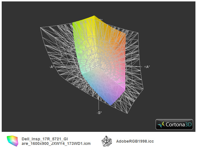 Farbräume und TFT-Kalibrierung sind ein Thema für alle, die sich professionell mit Bildbearbeitung und Druck beschäftigen. Diese sind nicht die Zielgruppe des Inspiron 17R, aber die Messergebnisse wollen wir der Vollständigkeit wegen auflisten. Der kleine sRGB-Raum wird nicht annähernd abgedeckt, folglich auch nicht AdobeRGB. Wir stellen die Abdeckung in den Vergleich zum IPS-Display des Aspire V3 (nur bestimmte Modelle!) und sehen: Farbraum ist nicht mit Kontrast oder Blickwinkeln gleich zu setzen. Der Aspire deckt sRGB ebenfalls nicht ab, die Räume von 17R und V3 IPS sind nahezu ident.