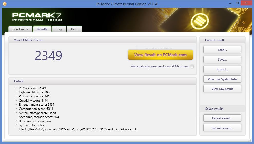 Der PCMark 7 beurteilt die Anwendungsleistung eines Windows PC. Das Ergebnis kann mit 2.349 Punkten lediglich das an CPU-Throttling kränkelnde G780 und das schwache Pentium System Vaio SV-E17 schlagen. Fakt ist aber auch, dass selbst die Quadcore-Systeme bestenfalls 17 % mehr Punkte ergattern. Im Falle des Pavilion g7-2007eg liegt der höhere Gesamtscore zum Teil an der Radeon HD 7670M. Interessant: Auch die stärkere GeForce GT 650M (Inspiron 17R SE) vermag es nicht, den System-Score signifikant nach oben zu drücken. Im Falle dieses Konkurrenten bremste die HDD das System ab. Lediglich das Thema SSD würde für unser 17R, sowie für alle Konkurrenten, die Gesamtleistung mess- und fühlbar erhöhen.