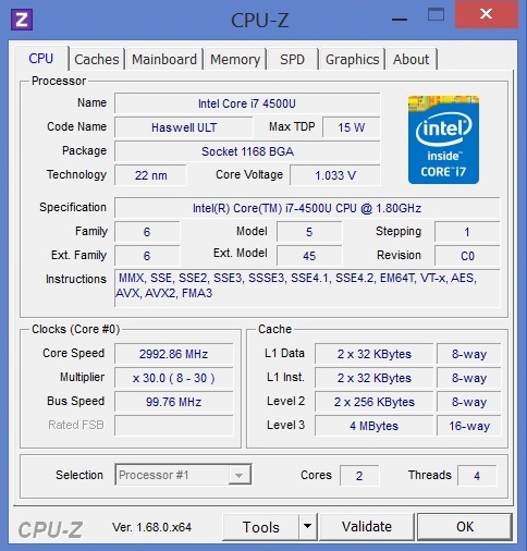 Beim Core i7-4500U handelt es sich um ein energieeffizientes ULV-Modell, das im Gegensatz zu anderen Dual-Cores wie dem Core i5-4300M mit einer TDP von 15 statt 37 Watt spezifiziert ist. Der L3-Cache wurde mit vier zu drei MByte dagegen etwas höher angesetzt. Als Mitglied der Haswell Generation basiert der Chip auf 22 nm kleinen Strukturen.