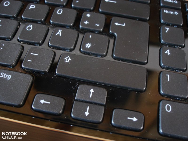 Des Weiteren sind die freistehenden Tasten (Chiclet-Design) relativ klein geraten. Insbesondere die Pfeil- und die F-Tasten offenbaren sich als arg schmal. Aufgrund der großzügigen Abstände kommt es dennoch eher selten zu Fehleingaben. Schade: Von einer praktischen Beleuchtung hat Dell abgesehen.