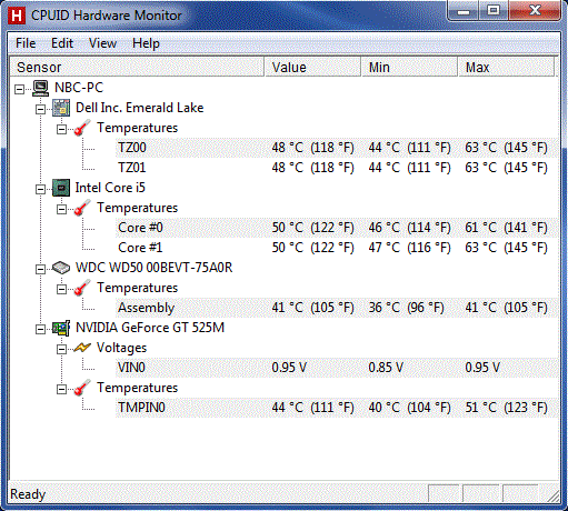 Wagen wir einen Blick ins Gehäuseinnere. Im Idle-Betrieb werden die Komponenten nicht herausragend, aber zumindest anständig gekühlt. Während sich der Prozessor auf rund 50°C erwärmt, erreicht Grafikkarte um die 44°C. Unter Volllast gehen die Temperaturen auch vollkommen in Ordnung, Core i5-2410M und GeForce GT 525M siedeln sich bei knapp 80°C an.