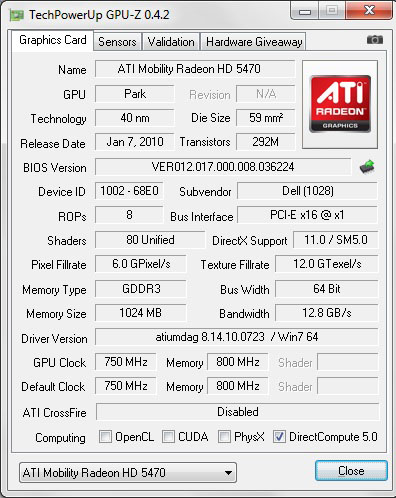 Ebenso befindet sich eine ATI Mobility Radeon HD 5470 mit 1024 MB GDDR3 Speicher mit an Bord, die mit nur 64 Bit angebunden sind. Mit dieser Einsteiger-Mittelklassegrafikkarte besitzt das Inspiron 17R zwar genug Rechenleistung um auch aktuellere Spiele, mit Abstrichen hinsichtlich der Auflösung und der Grafikdetails, flüssig darstellen zu können, für High End Gaming in voller Grafikpracht und Auflösung ist die verbaute GPU allerdings zu schwach. Dieser Chip ist auch DirectX 11 fähig und wird im 40nm Verfahren hergestellt, was der TDP (Thermal Design Power) zugute kommt, und schlussendlich auch der Akkulaufzeit.