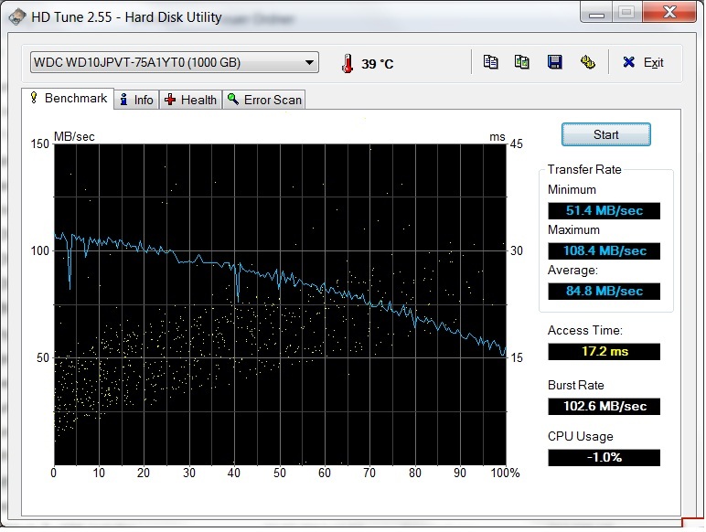 Das Inspiron 17R SE baut (leider) nach wie vor auf die altbewährte Festplatte. In unserem Fall auf eine von Western Digital (WDC Scorpio Blue WD10JPVT-75A1YT0), die auch schon beim kleineren Inspiron 15R SE zum Einsatz kam. Somit ist es nicht sehr verwunderlich, dass die Performance hinsichtlich der verbauten HDDs ziemlich nah beieinander liegen. So besitzt auch die in unserem Testgerät verbaute ein Terabyte-Festplatte - mit einer Arbeitsgeschwindigkeit von 5400 Umdrehungen pro Minute - eine durchschnittliche Transferrate von guten 84,8 MB/Sek. und setzt sich somit vor die der Samsung SpinPoint M8, so wie sie beim Medion Akoya P7815 Notebook zum Einsatz kam. Mit einer Zugriffszeit von nur 17,2 ms muss sich unsere Festplatte vor einem Vergleich mit einer 7200er HDD nicht verstecken. Leider bietet Hersteller Dell für seine Inspiron R SE Modelle nach wie vor keine SSD-Option bei der Bestellung an. Somit ist man gezwungen, selbst Hand anzulegen, wenn man auf eine SSD umsteigen will. Mit einem Kreuzschraubenzieher und etwas Fingerspitzengefühl sollte das allerdings kein allzu großes Problem sein.