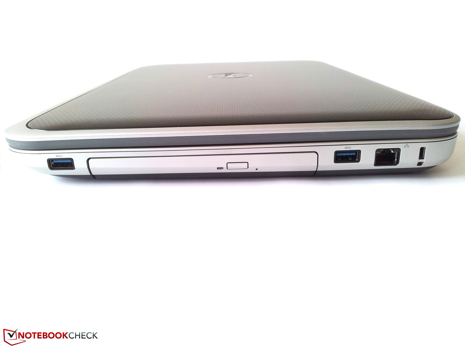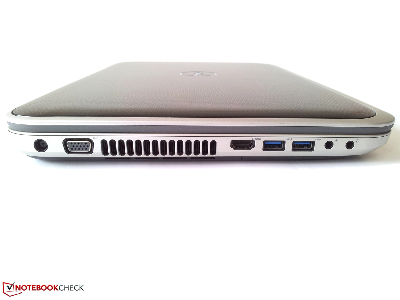 Auf der linken Seite finden wir den Netzstecker, den analogen Videoausgang gefolgt von der Lüftungsöffnung. Gleich daneben befinden sich der HDMI-Anschluss sowie zwei USB-3.0-Schnittstellen (einer davon mit Power Share) und die Steckplätze für Mikrofon und Kopfhörer. Auf der rechten Seite hingegen geht es etwas ruhiger zu. So befindet sich zwischen zwei USB-3.0-Schnittstellen das optische Laufwerk (PLDS DVD+-RW DS-8A8SH), gefolgt von einem RJ45 Ethernet-(10/100)-Anschluss und der Buchse für ein Kensington Lock.