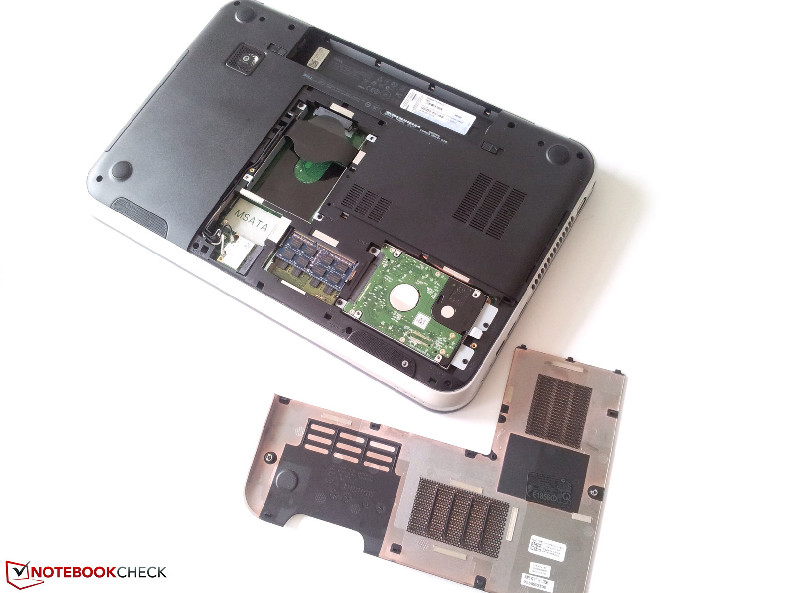 Der Zugang zur Festplatte oder zum RAM des Inspiron 17R SE ist leicht hergestellt. Dabei ist nur das Lösen von zwei kleinen Schrauben notwendig, die sich auf der Unterseite der Bottom Base befinden. Danach lässt sich die L-förmige Abdeckung mit etwas Fingerspitzengefühl leicht abnehmen. WLAN-Modul, die HDD und auch der RAM sind nun zugänglich und ebenfalls ein mSATA und ein weiterer HDD-Steckplatz. Der Zugang zwecks Reinigung zum Lüfter und der Heatpipe bleibt dem normalen User leider verwehrt. Um an diese ranzukommen, muss in weiterer Folge die Tastatur und Palmrest (Handballenauflage) entfernt sowie das übrige Gehäuse weiter demontiert werden, wobei man hier den Verlust der Garantie riskiert..