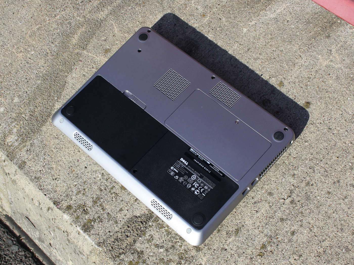 Ein Blick auf die Fotos des Inspiron M301z kann täuschen. Die Oberflächen bestehen nicht aus gebürstetem Aluminium, sondern aus lackiertem Kunststoff mit Hairline-Finish. Die im Sonnenlicht schimmernde Optik macht viel her. Aber nur solange, bis eine Schicht von Fingerabdrücken jede Stelle des 13.3-Zollers bedeckt. Selbst die Unterseite der Base Unit ist mit einem schwach glänzenden Lack überzogen. Die Haptik ist daher glatt bis hin zu rutschig.