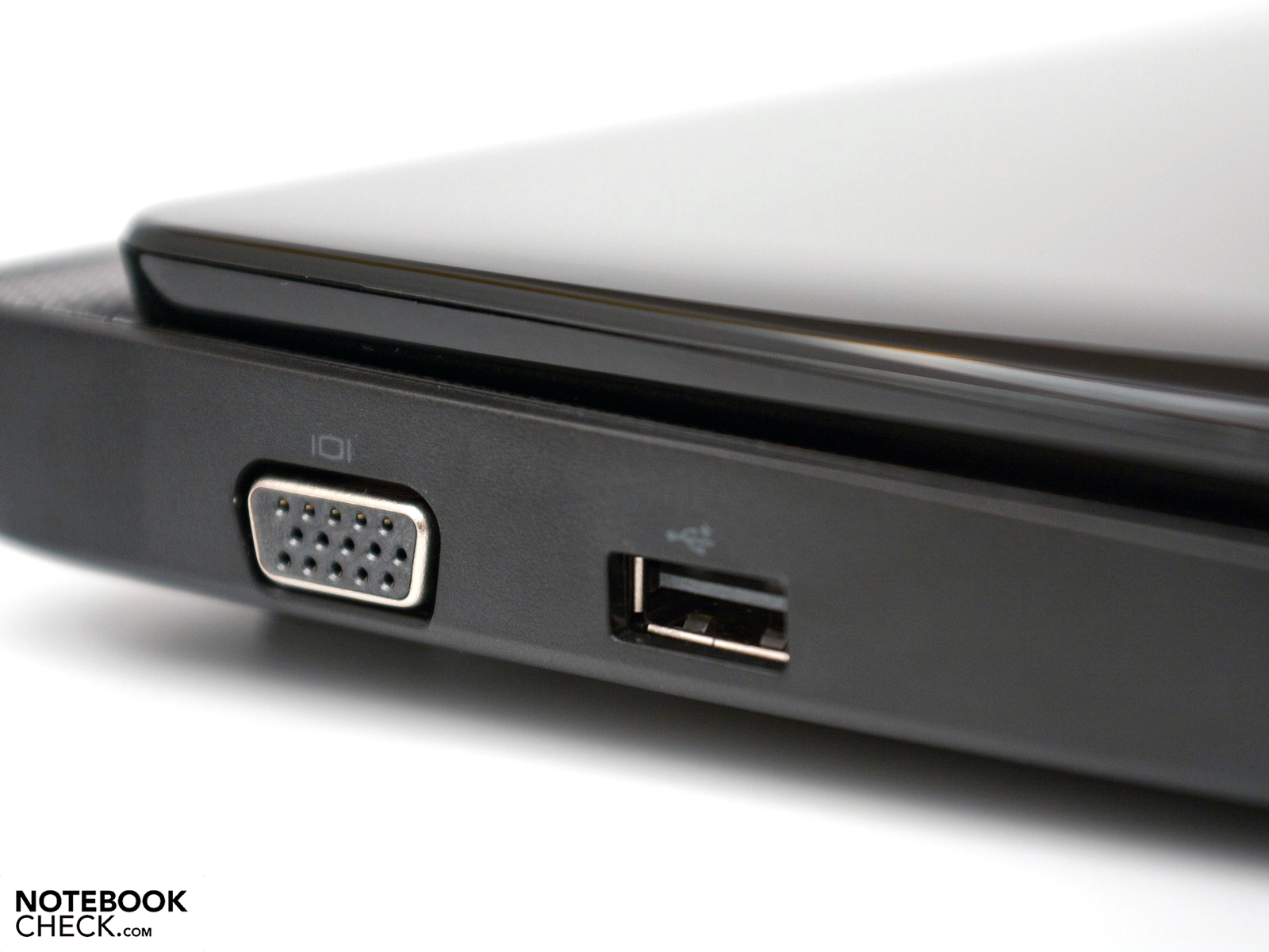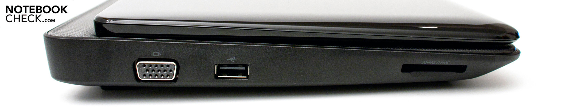 Der integrierte Kopfhörerausgang an der rechte Seite des Gerätes ermöglicht nur den Anschluss von Kopfhörern oder einem externen Boxensystem, da es sich nicht um einen Kombi-Port handelt. Für die Aufnahme oder Übertragung von Audiosignalen via Skype ist ein analoges Mikrofon im Bereich der Webcam integriert. Neben dieser Reduktion im Bereich „USB“ und „Audio“ finden sich ein analoger Videoausgang (VGA), ein Kensington Lock Slot, der RJ-45-Netzwerkanschluss sowie ein 3-in-1-Kartenleser, der SD (SDHC), MMC und MS (MS PRO) lesen und beschreiben kann.
