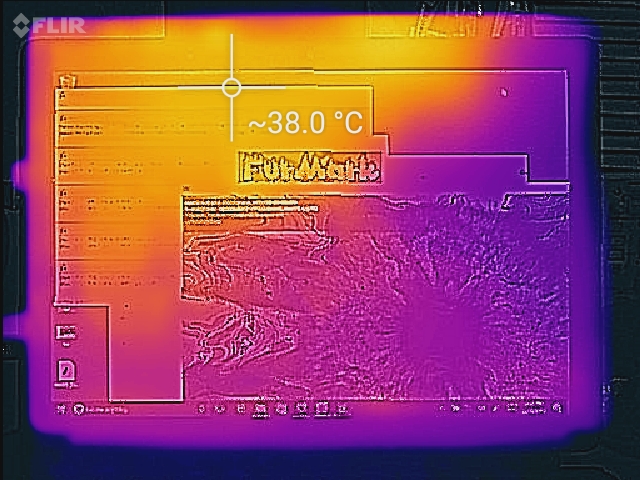 (+) Die maximale Temperatur auf der Oberseite ist 38.2 °C. Im Vergleich liegt der Klassendurchschnitt bei 35.3 °C (von 19.6 bis 60 °C für die Klasse Convertible).