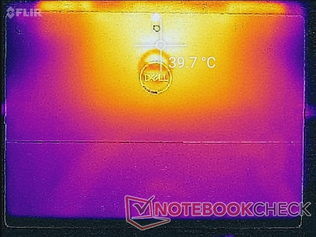 Die Oberflächentemperaturen sind größtenteils gleichmäßig verteilt mit einem einzelnen Hotspot oben in der Mitte. Bei hoher Auslastung, wie zum Beispiel Gaming, kann sich dieser auf bis zu 40 °C erwärmen. Surface Pro 7 und Yoga Duet 7. erreichen hier bis zu 44 oder gar 45 °C.