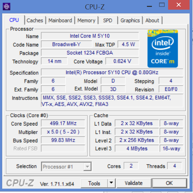 Dell hat das Latitude mit einem Abkömmling aus Intels neuer Broadwell-Prozessor-Generation bestückt. Es handelt sich um den Core M-5Y10 Zweikernprozessor. Das 'Y' verrät, dass es sich hier um ein sehr sparsames ULV-Modell handelt. Intel beziffert die TDP mit 4,5 Watt. Diese erlaubt eine passive Kühlung der CPU, die beim Latitude auch umgesetzt wird. Der Prozessor arbeitet mit einer Basisgeschwindigkeit von 800 MHz. Per Turbo kann die Geschwindigkeit kurzfristig auf bis 2 GHz gesteigert werden. Der Core M unterstützt Hyperthreading (pro Kern können zwei Threads gleichzeitig bearbeitet werden).