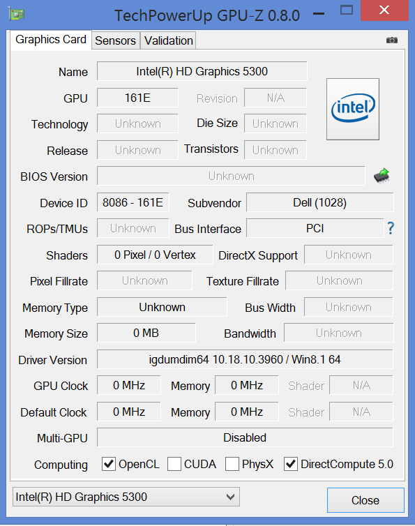 Der Grafikkern des Latitude trägt die Bezeichnung HD Graphics 5300 und stammt wie die CPU von Intel. Der Kern unterstützt DirectX 11.2 und kann mit Geschwindigkeiten zwischen 100 und 800 MHz arbeiten. Die Resultate in den 3D Mark Benchmarks zeigen aber, dass er seine Maximalgeschwindigkeit nicht nutzt. Die Ergebnisse fallen durchweg schlechter aus als beim HP Envy x2 15-c000ng, das mit der gleichen CPU-GPU-Kombination bestückt ist und ebenfalls passiv gekühlt wird. Das kleinere Gehäuse des Latitude erfordert niedrigere Geschwindigkeiten, um eine übermäßige Erwärmung zu vermeiden. Die Werte des Latitude liegen in etwa auf einer Höhe mit denen von Notebooks, die mit dem HD Graphics 4200 Kern bestückt sind. Das Latitude profitiert von seinem im Dual-Channel-Modus arbeitenden Arbeitsspeicher. Würde dieser im Single-Channel-Modus laufen, würden die 3D Mark Resultate noch schlechter ausfallen.