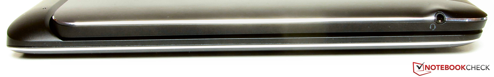 Das Tablet-Element hat neben dem Audiokombo-Steckplatz noch ein Fingerabdrucklesegerät, einen SmartCard-Leser und einen eigenen Netzanschluss (auf der Unterseite des Tablets; im angedockten Zustand nicht nutzbar) zu bieten. Eine USB-Schnittstelle oder einen Speicherkartenleser bringt es nicht mit. Diese sind am Tastaturdock zu finden. Dell hat die nötigsten Schnittstellen in das Dock gepackt. Ein externer Monitor kann per Mini-Displayport angeschlossen werden. Zwei USB-3.0-Anschlüsse sind ebenfalls vorhanden. Zusätzliche Schnittstellen können mit einem separat erhältlichen Adapter (USB 3.0 auf HDMI/VGA/Ethernet/USB 2.0) für den USB-3.0-Steckplatz nachgerüstet werden.