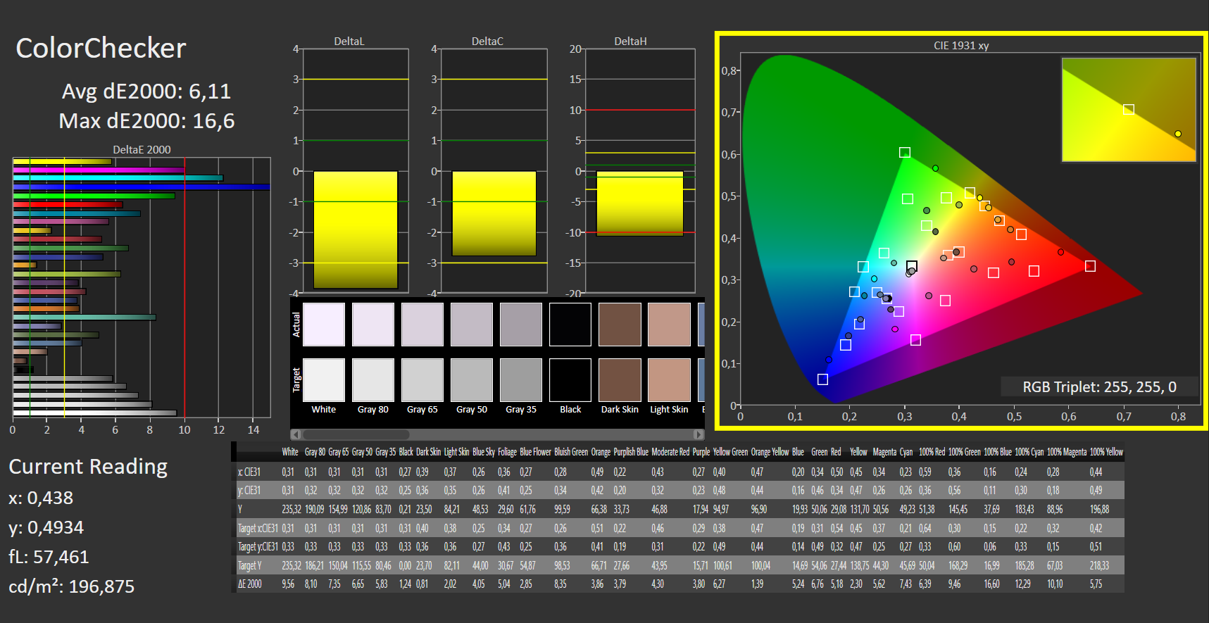 | Delta E Colorchecker * | 6.11 | 3.6 41% | 5.6 8% | 4.04 34% | 1.4 77% |