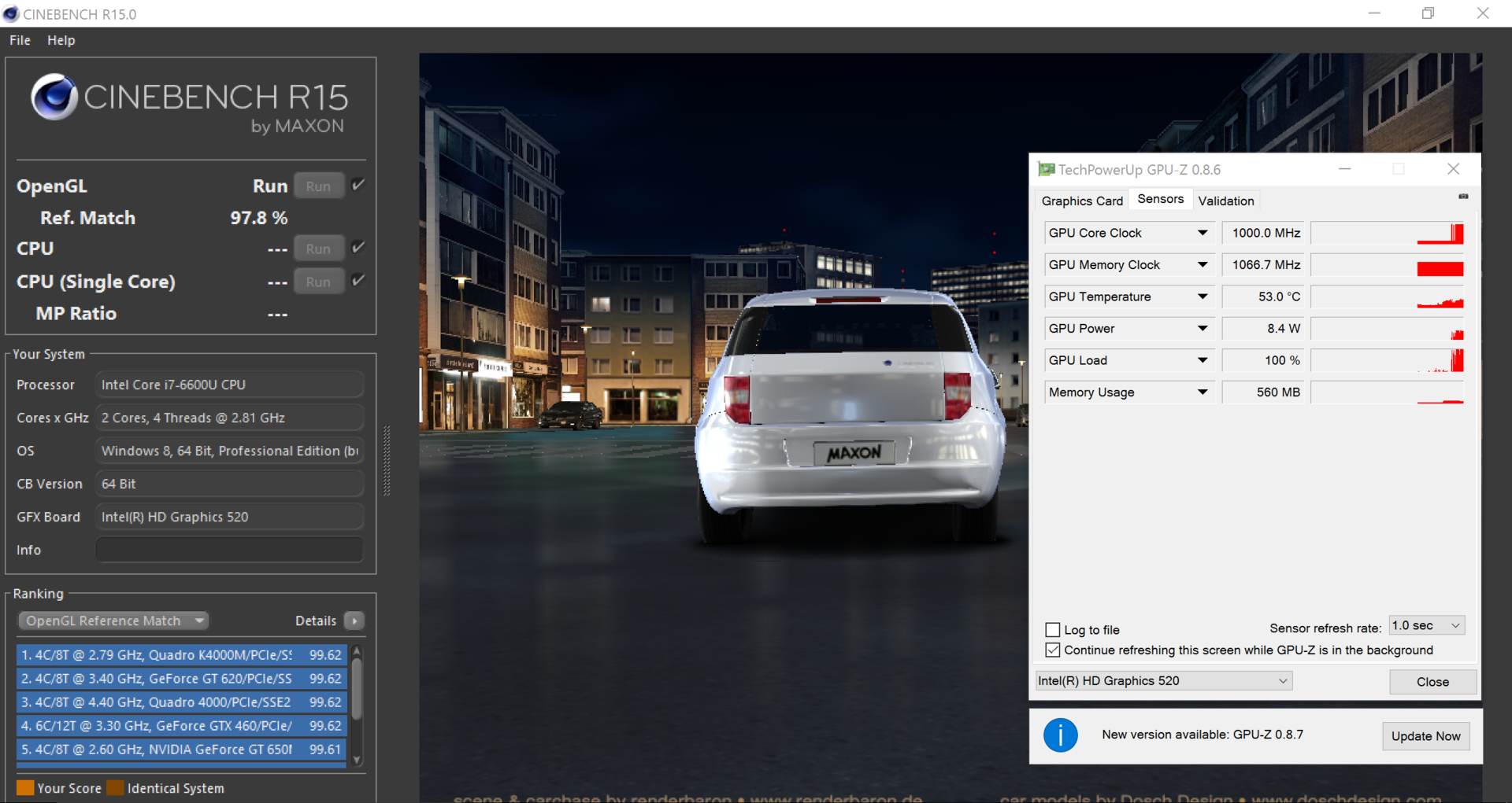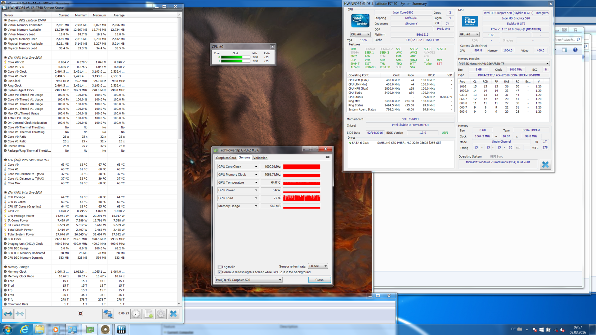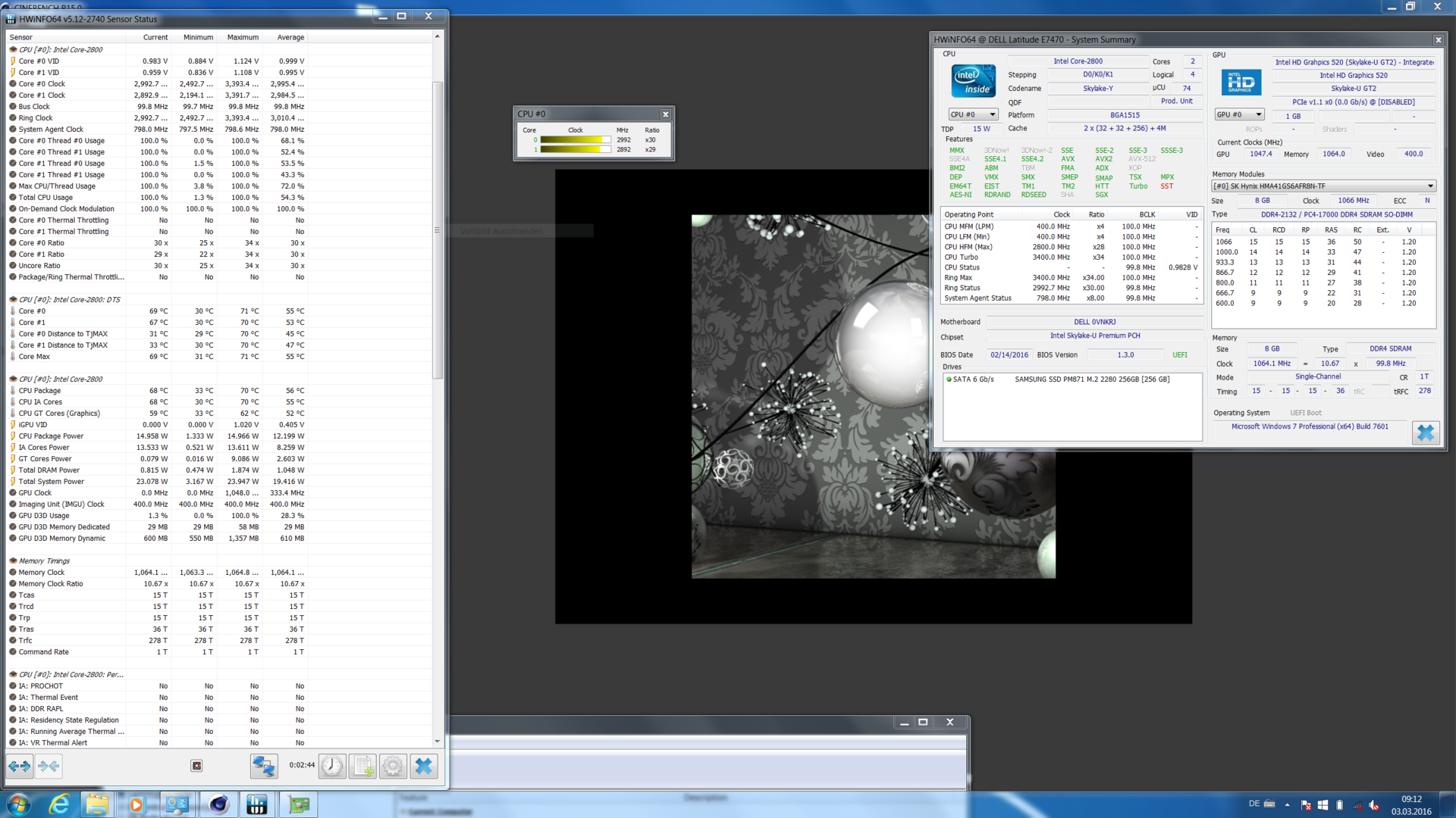 Wird die geradezu phänomenal geringe Lüfteraktivität durch Throttling unter Last ermöglicht? Bei einfacher CPU/GPU-Last ist das nicht so, das haben die Cinebench-Tests geklärt. Im Stresstest sackt die Taktung dann tatsächlich bis auf den Normaltakt herunter, jetzt schon von Throttling zu sprechen wäre aber nicht angemessen. Zumal sich die HD 520 darum gar nicht schert, trotz Prime95-Stresstest rechnet sie konstant und zu jeder Zeit mit 1.000 MHz.