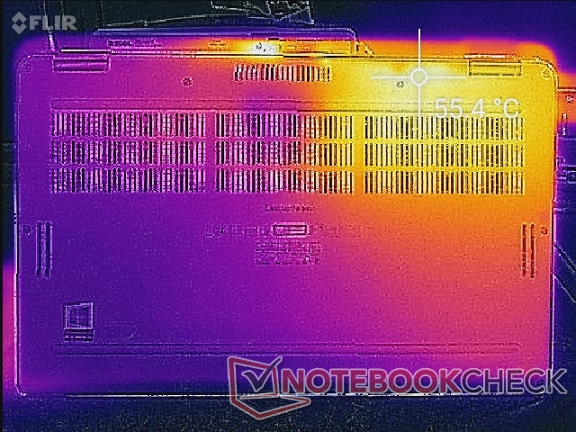 (-) Auf der Unterseite messen wir eine maximalen Wert von 55.2 °C (im Vergleich zum Durchschnitt von 36.8 °C).