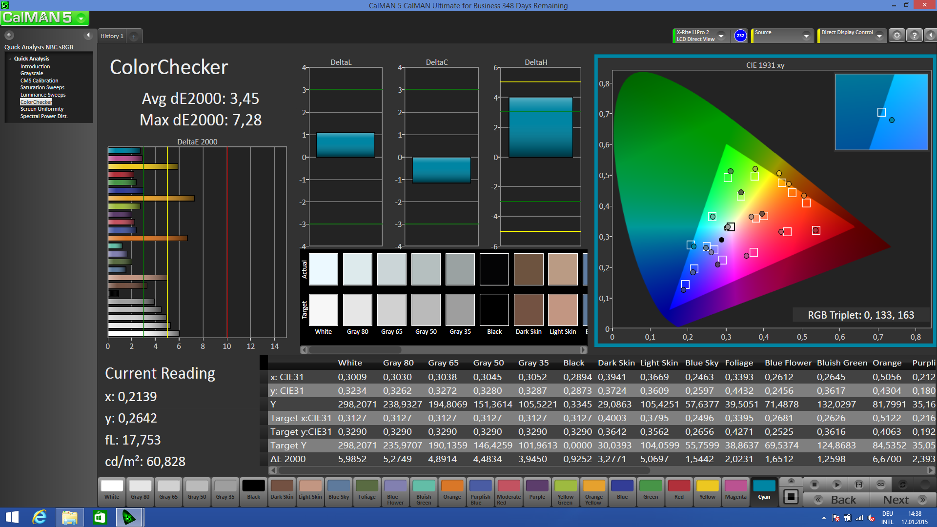 Bereits ab Werk erweist sich das Display als recht präzise eingestellt. Farben und Graustufen liegen mit mittleren Delta-E-Werten von etwa 3,5 nah am Ideal, eine zusätzliche Kalibrierung unsererseits verringert die Abweichungen sogar um weitere rund 1,5 Punkte (Delta E Farben: 2,1; Graustufen: 1,8). Dabei wird auch die zuvor ein wenig zu kalte Farbtemperatur angeglichen. Eine Farbraumabdeckung von 92 Prozent sRGB- (Korrektur 20.5.2015 zufolge fehlerhaften Referenz-sRGB-Profils) und 60 Prozent AdobeRGB-Abdeckung ist für ein Notebook dieser Klasse mehr als akzeptabel.