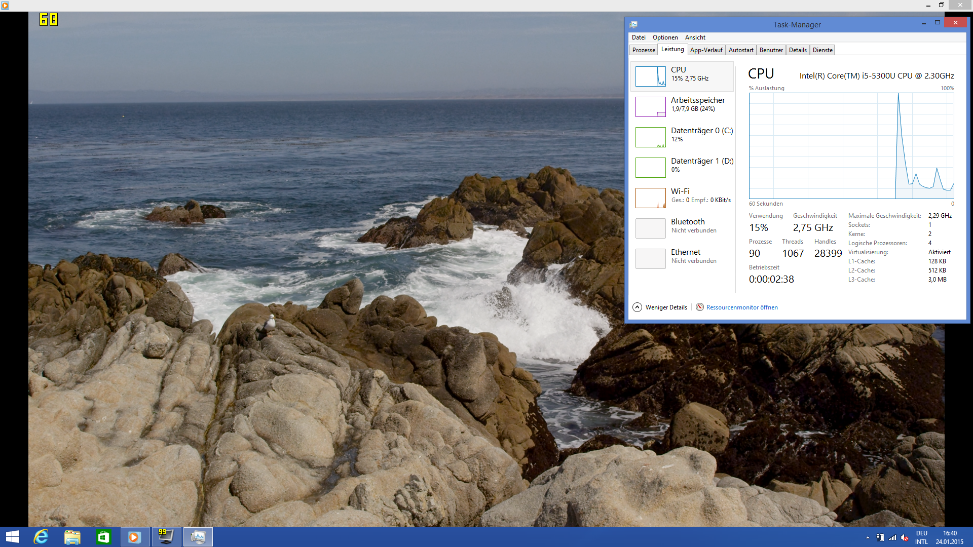 Erwartungsgemäß hält der Core i5-5300U auch bei andauernder Auslastung beider CPU-Kerne stets die vollen 2,7 GHz und übertrumpft in längeren Benchmarks sogar einen Core i7-4600U oder i7-4650U. Der Vorsprung auf den Core i5-4300U beziffert sich je nach Szenario und Testgerät auf circa 5 bis 10 Prozent. In Single-Thread-Benchmarks platziert sich der 2,9 GHz schnelle Broadwell-Chip in etwa zwischen den Core-i5- und Core-i7-Ablegern der Haswell-Generation.