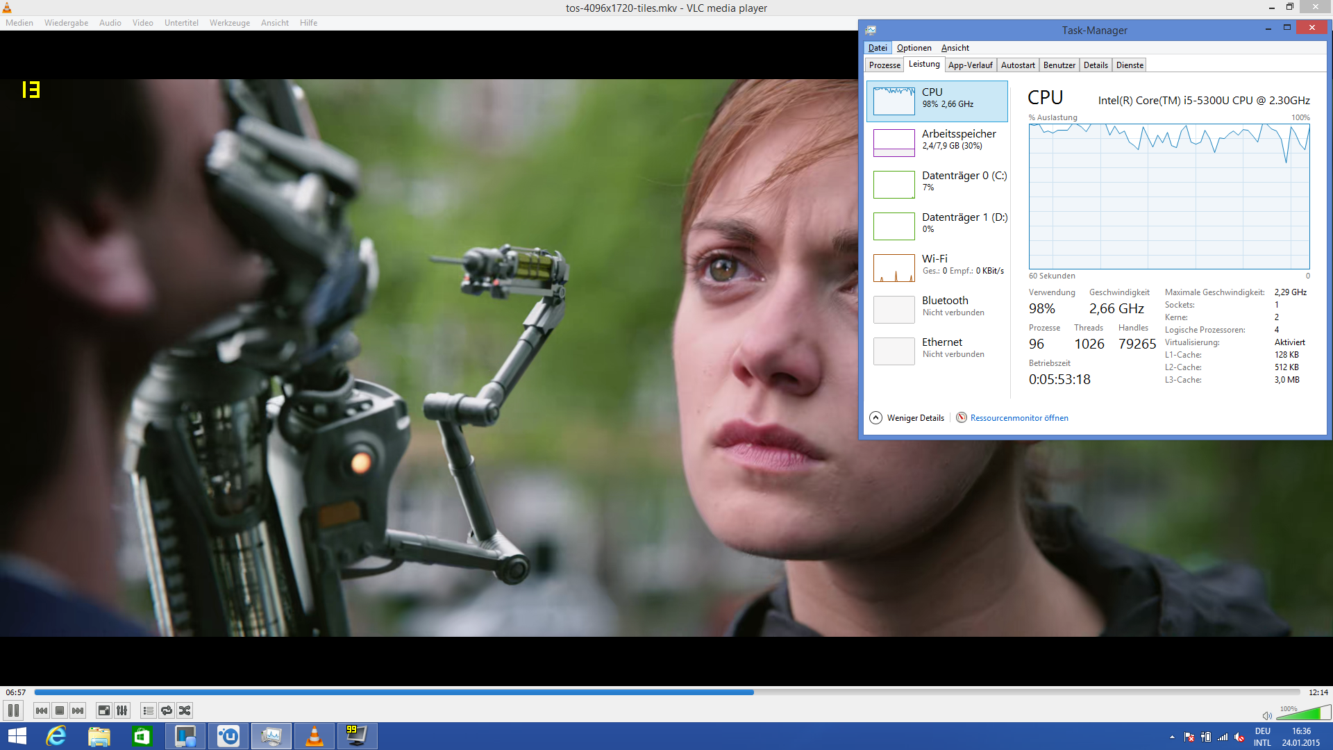 14-Nanometer-Fertigung hin oder her: Auch der Core i5-5300U muss seine Frequenzen unter Volllast drosseln, um die TDP von 15 Watt nicht dauerhaft zu überschreiten. In unserem Stresstest fiel der CPU-Takt nach kurzer Zeit bis auf 1,5 GHz ab, während die GPU mit 800 MHz nahe am Turbo-Boost-Limit von 900 MHz operierte. Offensichtlich bevorzugt Intel (wie auch AMD) bei kombinierter Last weiterhin die Grafikeinheit gegenüber dem Prozessor, anstatt beide Komponenten bei jeweils mittlerer Taktrate zu betreiben. Als gänzlich unkritisch erweist sich die Kerntemperatur des Chips: Mehr als rund 70 bis 80 °C konnten wir selbst mit synthetischen Tools nicht erzeugen.