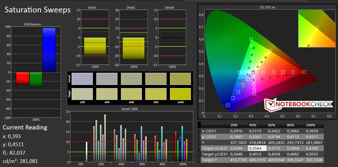 Keine Lorbeeren verdient sich das Latitude in den CalMAN-Tests. DeltaE-Werte der Farben von über 13 und 14,48 bei den Graustufen sind Indizien für eine im Vergleich zum sRGB Farbraum sichtbar nicht korrekte Farbdarstellung. Besonders deutlich zu sehen ist ein Blaustich. Die Abdeckung des Adobe Raumes (34 %) und sRGB-Raumes (49 %) lassen auf eine nicht professionelle Eignung im Bereich Foto und Grafikbearbeitung schließen.
