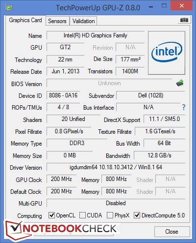 Eine Intel HD Graphics 4400 wird in dem Prozessor integriert. In unserem Fall taktet die Prozessorgrafikkarte mit einem Kerntakt von 600-1.100 MHz. Das Einsatzgebiet lässt sich parallel zur CPU eingliedern. Die interne Grafikkarte erlaubt die Nutzung neuerer Standards wie DirectX 11.1, OpenCL 1.2 und OpenGL 4.0. Einen Blick auf den 3DMark Benchmark verrät uns, dass das Rugged Extreme rund 15 % besser abschneidet. Diesen Vorsprung erzielt es mittels des im Dual-Channel arbeitenden Arbeitsspeichers. Um optional auch eine bessere Grafikleistung zu bieten, führt Dell eine Nvidia GeForce GT 720M als Ausstattungsvariante an. Für weitere Vergleiche sei auf unsere Benchmarkliste mobiler Grafikkarten verwiesen.