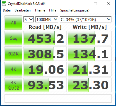 Wie man dem Diagramm unschwer ansieht, hat unser Testgerät den Vergleichsnotebooks seine 128-GB-SSD voraus und spielt so in Sachen Massenspeicher-Performance in einer anderen Liga. Bei der sequenziellen Übertragung von großen Datenblöcken erreicht die SSD das SATA-3-Limit von etwas mehr als 500 GB/s nicht ganz, geht es um das Einlesen von kleinen, verteilten 4K-Blöcken, werden die mindestens 20 MB/s, die wir von einer modernen SSD erwarten, knapp verfehlt. Alles in allem performt die Samsung-SSD durchschnittlich, gemessene Unterschiede zu schnelleren Modellen machen sich in der Praxis fast nie bemerkbar.