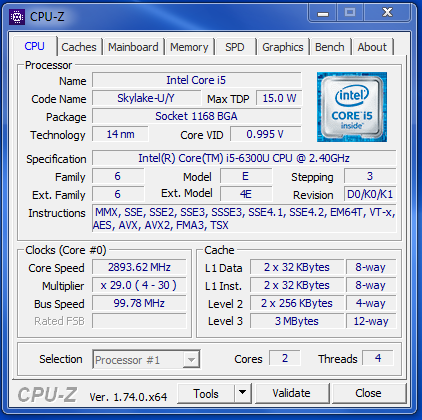 Mit dem Intel Core i5-6300U (Skylake) Zweikernprozessor steckt eine Mittelklasse-CPU in dem Rechner. Die CPU sollte die Anforderungen der meisten Nutzer zufrieden stellen. Es handelt sich hier um ein sparsames ULV-Modell, das eine TDP von 15 Watt besitzt. Die CPU arbeitet mit einer Basisgeschwindigkeit von 2,4 GHz. Mittels Turbo ist eine Steigerung auf 2,9 GHz (beide Kerne) bzw. 3 GHz (nur ein Kern) möglich. Der Turbo kommt im Netz- und im Akkubetrieb zum Einsatz.