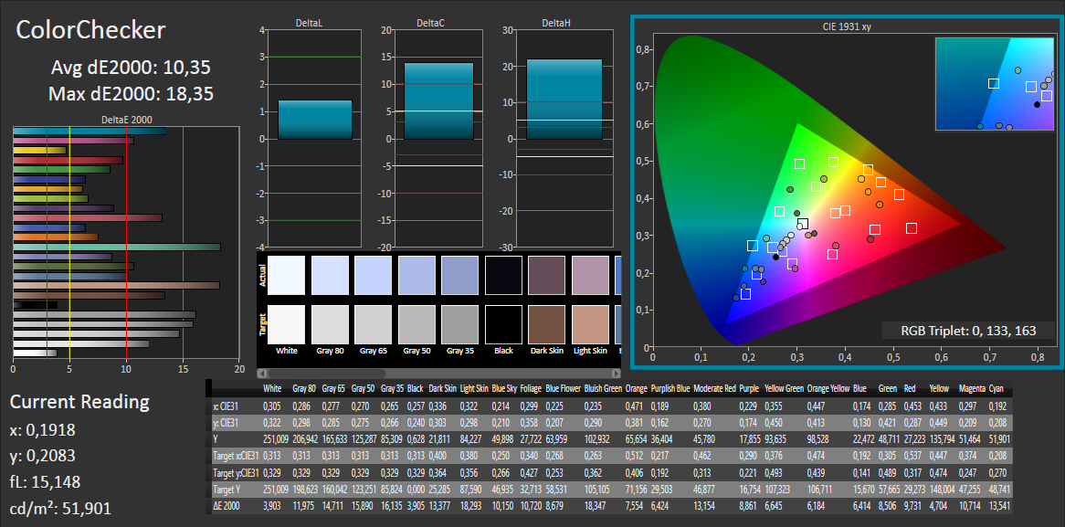 | Delta E Colorchecker * | 10.35 | 10.49 -1% | ||