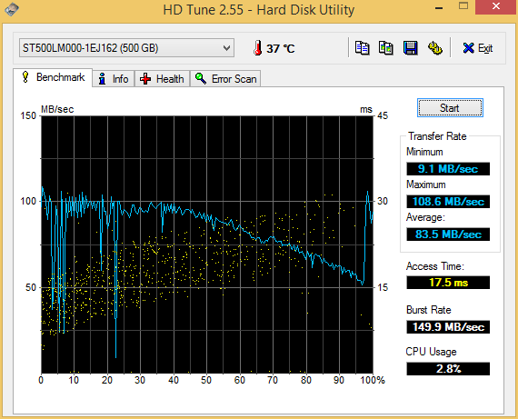Die Solid-State-Hybridfestplatte (500 GB, 5.400 U/min) besitzt 8 GB NAND, der als Cache von oft geladenen Daten benutzt wird. Dies ist eine Art lernendes System und soll die Start- und Boot-Zeiten deutlich verkürzen. Dieser Prozess läuft auch zügig ab, dies gilt jedoch nicht für Kopier- oder Installationsvorgänge. Diese sind sogar langsamer als mit einfachen HDDs, wie die folgende Tabelle in den einzelnen Messungen zeigt. Der Read Sequential fällt extrem schlecht aus, typisch sind 80 bis 110 MB/s. Hier punkten Lenovo und HP. Wir haben den CrystalDiskMark 3.0 zeitlich versetzt mehrfach ausgeführt, um eine Beeinträchtigung durch Hintergrundprogramme auszuschließen. Das Ergebnis blieb konstant so niedrig.